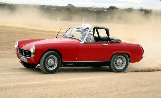 Russell Speak's big Rover went surprisingly well for a big car not usually connected to dirt driving. And local boy Jason Pickering entered his Falcont ute and drove like he uses dirt roads every day.... maybe he does, but it was impressive watching him lap the courses. The Datsun rally car entered by father and son Les and Shane Eather also impressed with sideways action all day. And having won its class in the MG Car Club Concours d'Elegance the previous day, James Saint's well-driven Midget was not quite so clean by the day's end.