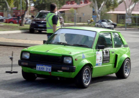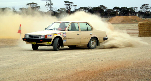 We had a fantastic day at Dowerin, with a very interesting cross-section of cars entered spanning a Hillman Imp to a Mitsubishi Evo. The Armenti family proudly debuted their latest competition car, a 'sturdy' Volvo 360GLT, which featured some spectacular decorations - see the photos below. And the O'Hara/Stean entry of a $250 Toyota Corona performed beyond expectations... The weather was kind to us, with an overcast day. The smooth dirt surfaces (they vary depending on each 'street') proved grippy in some areas and quite slippery in others. Nonetheless the two courses worked very well, with some opportunities to explore the handling of cars and limits of driving skill.