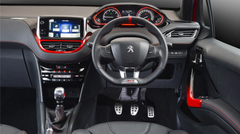 The instrument surrounds glow red (blue in lesser 208s) and the glass roof has hidden surround lighting. The big centre screen, a cool little iPad-inspired unit isn’t entirely intuitive to use, and is the centre for lots of the car’s operations. Sat Nav is standard in the GTI. There are some tasty flourishes of red in the dash and doors. There are lots of nice little details to surprise and delight.